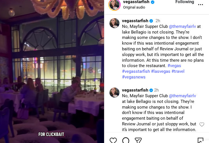 The confusion stemmed from an announcement by John Katsilometes of the Las Vegas Review-Journal (above), which led many to believe that the entire business was shuttering. In reality, the live production that takes place within the dining room is being replaced by another, causing for a pause in entertainment.