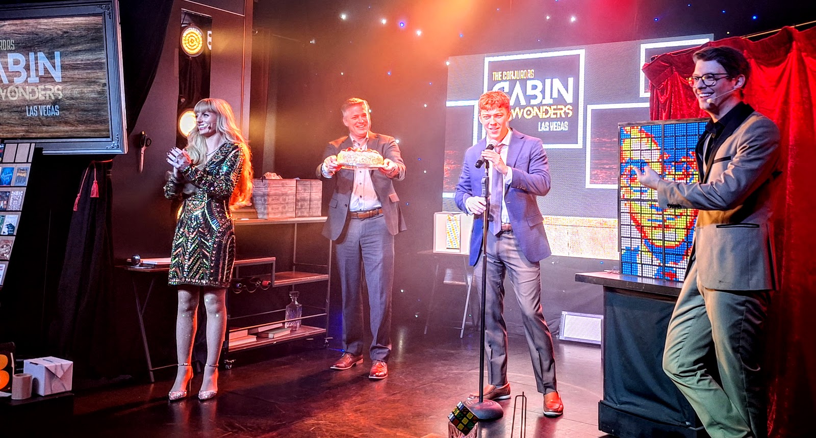 Last week, Damian Costa (left) and son Dayton (Pompey Entertainment) presented The Conjurors with a cake and post-show party. In attendance were familiar faces like Jennifer Romas (EXXCITE), Murray Sawchuck, Quinton Lopez (DITA LAS VEGAS, ATOMIC SALOON SHOW), Mervant Vera (America's Got Talent), and Vincent John (The Bronx Wanderers).