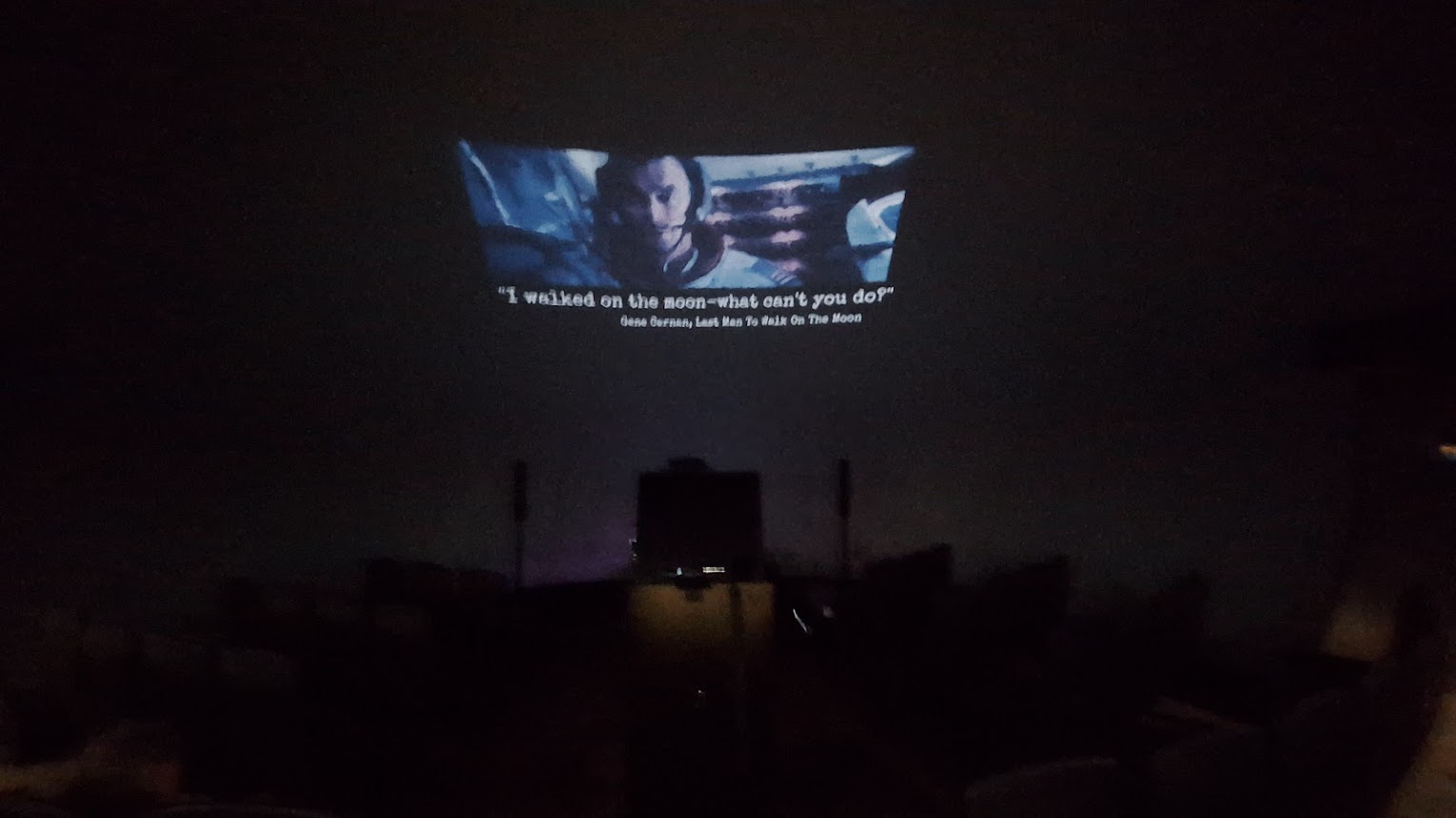 As audience members arrive, they're treated to a presentation that combines the history of space exploration with a pop-culture timeline. What's the message there?