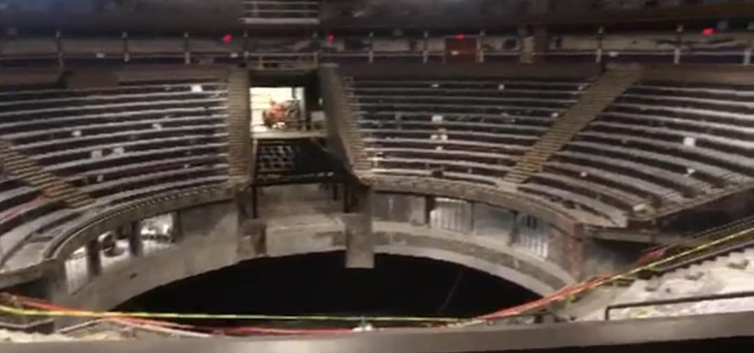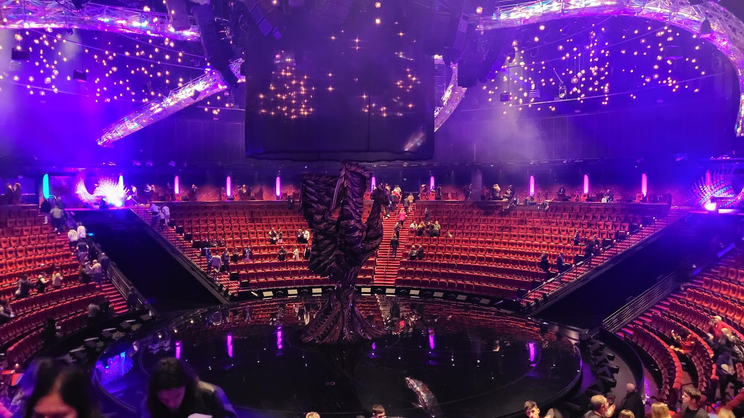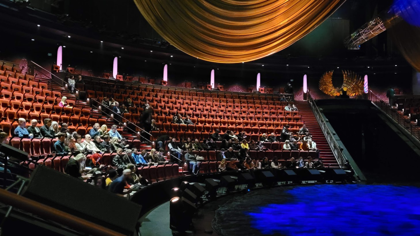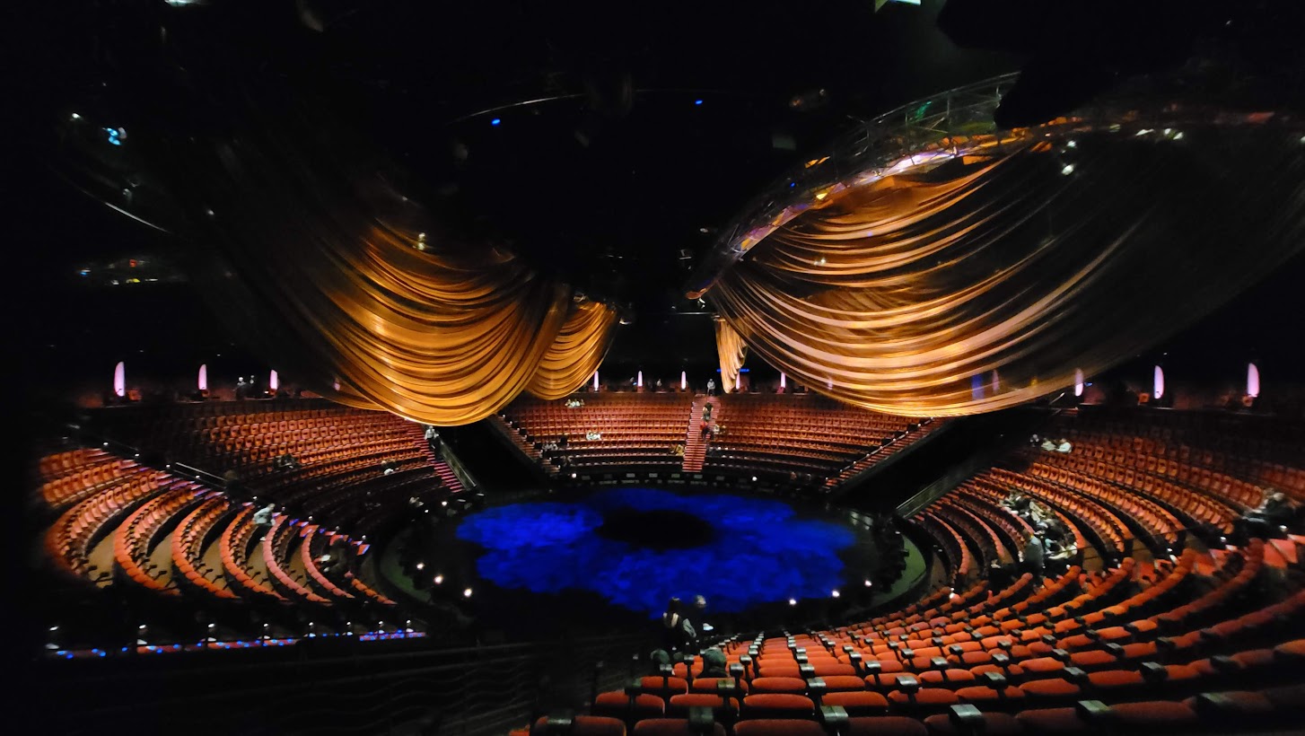 LE REVE was an aquatic spectacular whose centerpiece was a 27-foot-deep pool. With the water removed, the remaining pit has been converted into a massive lazy susan turntable. The flat stage-level surface has an outer ring and a disc at its center. Between them is a collection of crescent-shaped "pie sections".