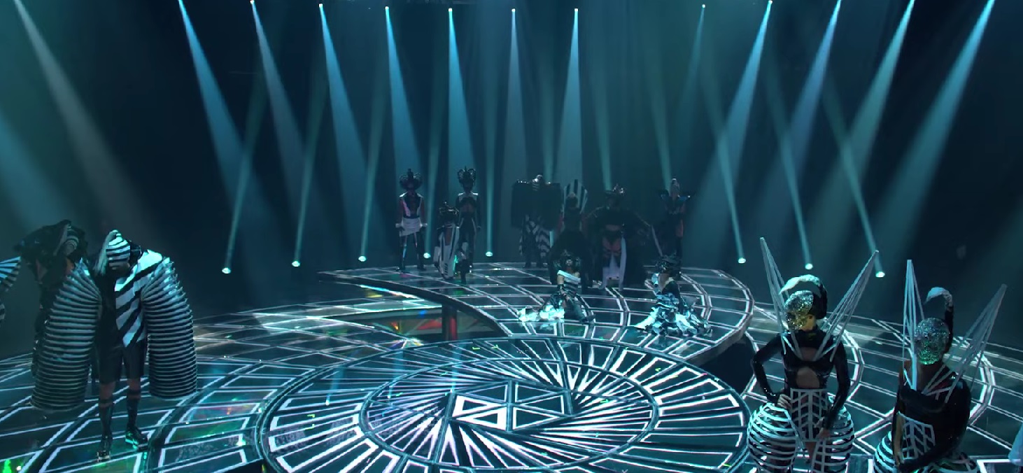 Each of the three areas can spin independently, rotate together, and raise or lower, depending on the needs of the scene. The entire floor is covered by LED screens to play video content like a television. It's basically a disco dance floor that can double as a spice rack. Where's John Travolta?