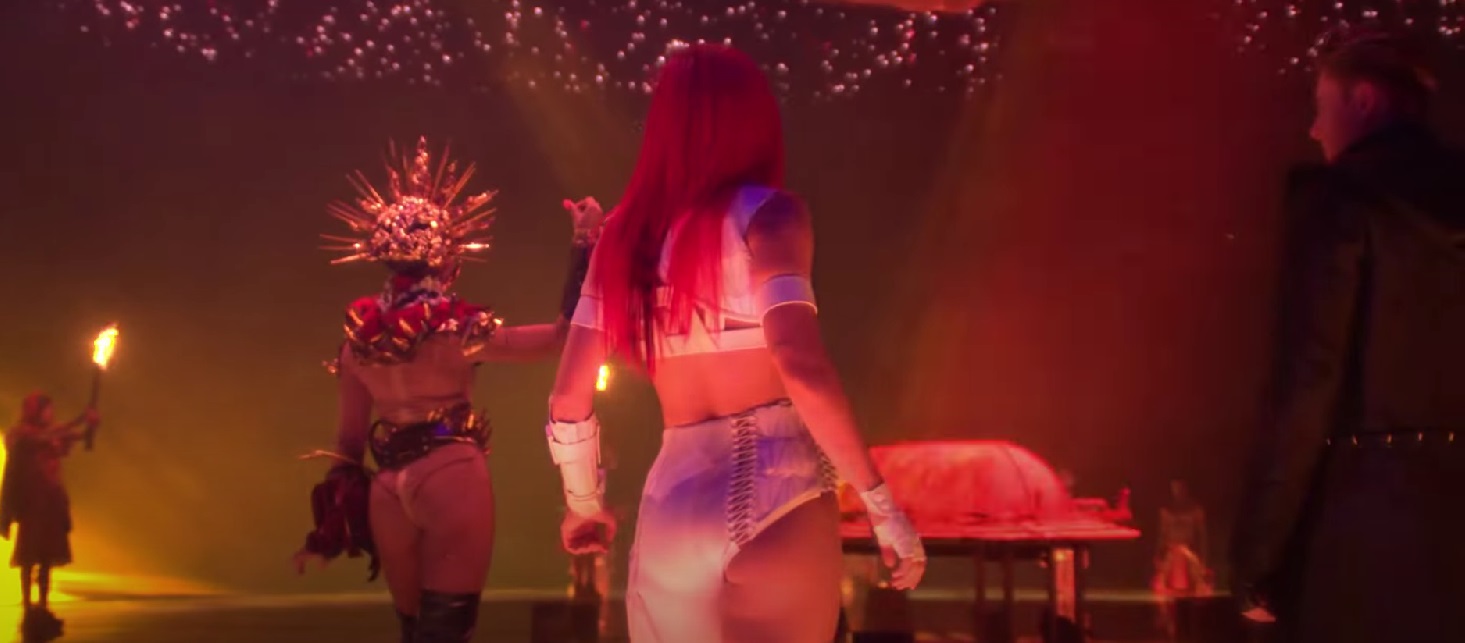 Once you've seen what the new hydraulic stage can do, you're stuck with a dumb-as-f*ck storyline that riffs on Disney and sword-and-sorcery films, video games, and most blatantly, THE FIFTH ELEMENT. That 1997 sci-fi epic introduced "Leeloo", a fire-haired goddess who joins Bruce Willis on a quest to reunite the four elements of nature (fire, air, earth, and water).