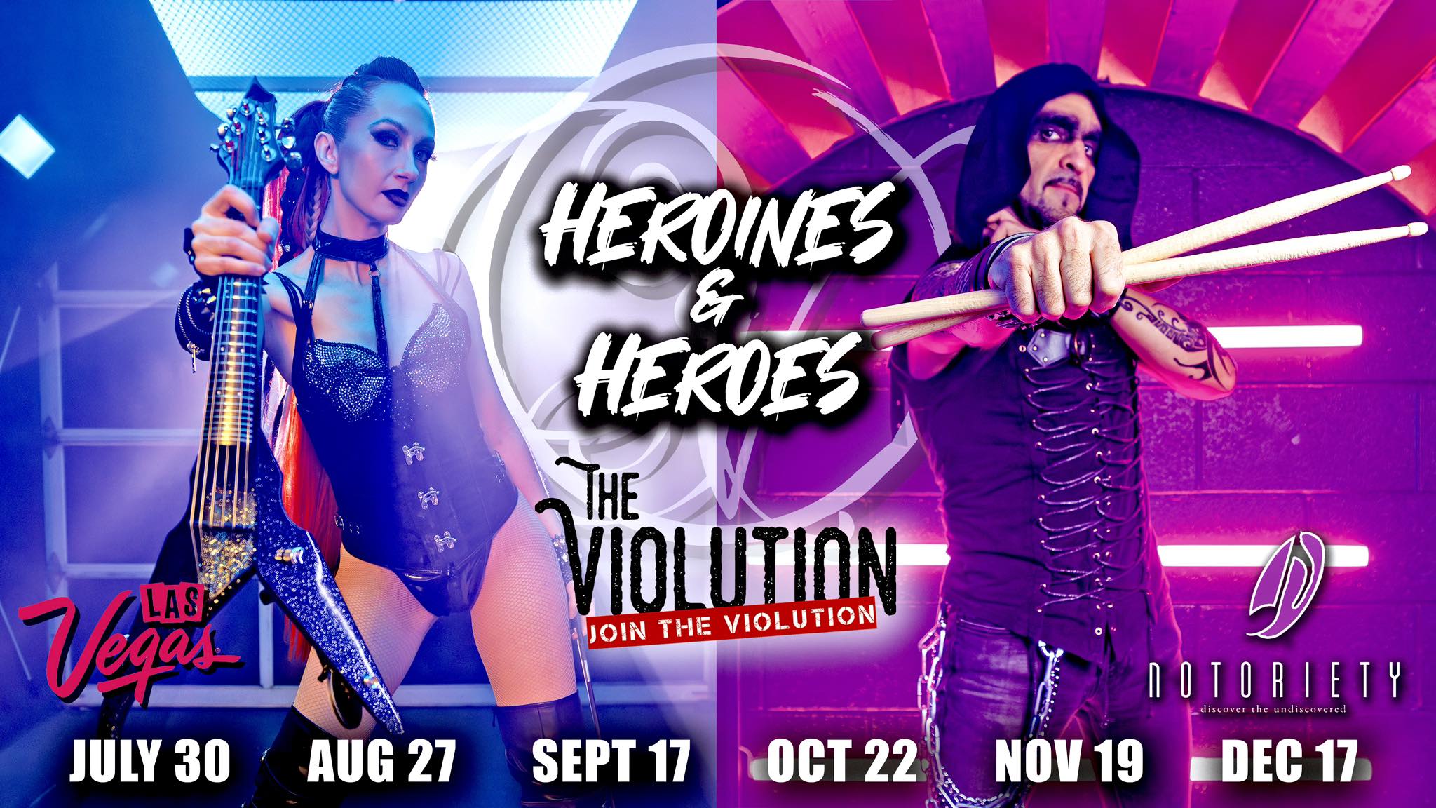 THE VIOLUTION: Heroines and Heroes at Notoriety Live - Electric violinist Jennifer Lynn and brooding drummer Patrick Caccia are the core players in THE VIOLUTION, a symphonic take on classic rock and metal. Original compositions are interspersed with covers of songs by Queen, Led Zeppelin, Iron Maiden, and more. Click here for dates, showtimes, and to reserve you seats.