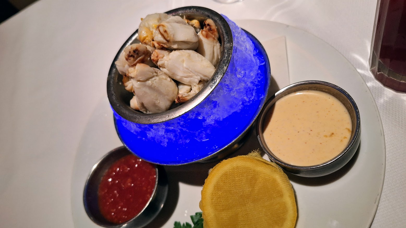 First was an outrageous CRAB COCKTAIL ($32). Served in a bowl chilled over blue luminescent ice, the colossal lump crab is accompanied by cocktail sauce, dijon aioli, and a half-lemon. Meaty and mouth-watering, it's generous enough to serve as a small meal for light eaters.