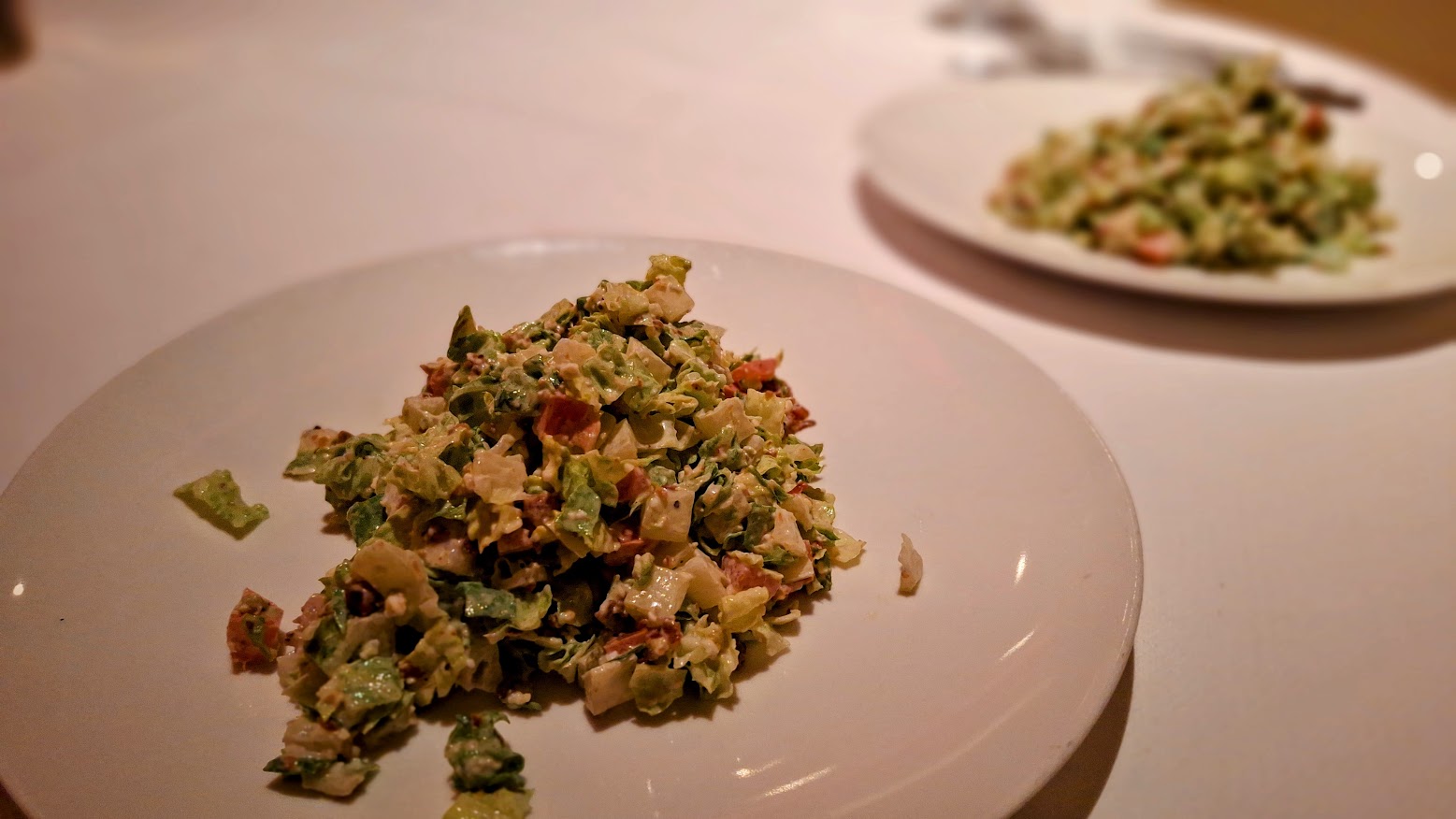 It seems to be an unwritten rule that you can't skip a beautiful steakhouse salad. T-Bones suggested THE STEAKHOUSE ($16 per person), a chopped beauty consisting of romaine, gorgonzola, avocado, tomato, applewood bacon, and a distinctive white French dressing. It was blended and served table-side.